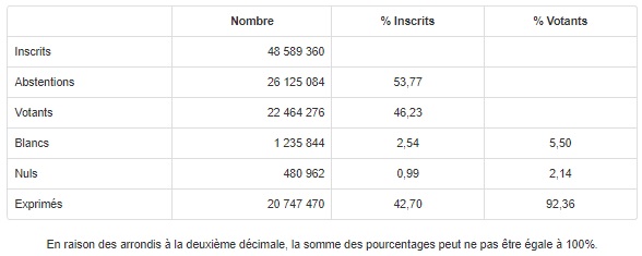 Sur fond d'une abstention très élevée de 52,49 %, c'est la déception pour Emmanuel Macron. La coalition présidentielle Ensemble ! qui réunissait pour ces élections Renaissance (anciennement LREM) et ses alliés n'obtiennent pas de majorité absolue à l'Assemblée nationale. Cette union obtient 245 sièges.